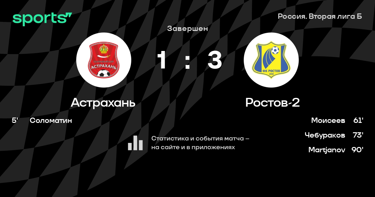 Результат прошлой игры в турнире «Вторая лига»: Динамо-2 Махачкала – Астрахань 1:1. После 23 туров Астрахань набирает 40 очков и занимает 7 место в турнире. Лучший бомбардир команды – Марк Полушин: он забил 6 в 18 матчах. В последних 5 играх Астрахань забивает 4 голов. В последних 5 играх Астрахань пропускает 7 голов.