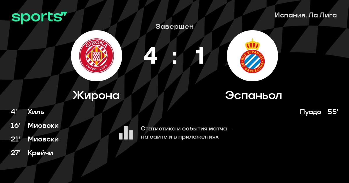 Гассанига - Блинд, Крейчи, Давид Лопес, А. Мартинес - Мигель Гутьеррес, Ромеу, ван де Бек, Асприлья, Хиль - МиовскиЗапасные: Хуан Карлос, Лопес, Хуанпе, Франсес, Солис, Мартин, Клуа, Артеро, Стуани, Цыганков, Данджума, Ким Мин Су