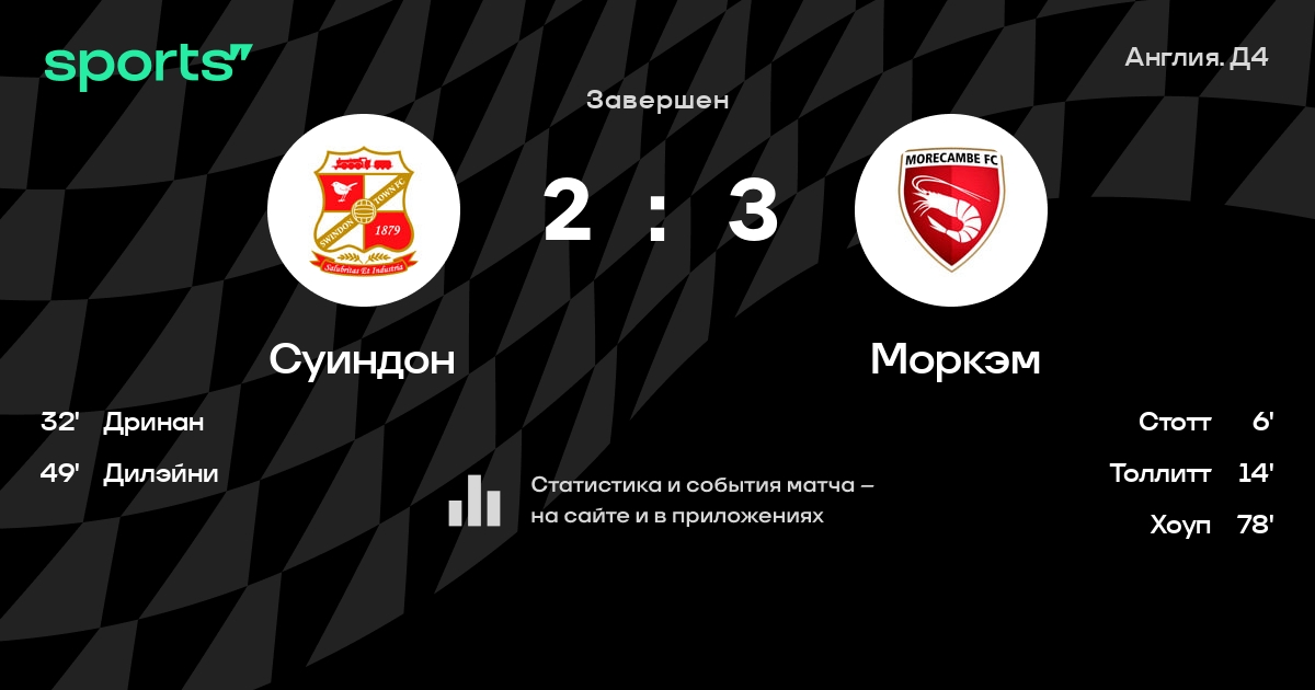 Результат прошлой игры в турнире «Лига 2»: Аккрингтон – Суиндон 2:2. После 16 туров Суиндон набирает 13 очков и занимает 22 место в турнире. Лучший бомбардир команды – Харри Смит: он забил 6 в 13 матчах. Суиндон не может выиграть в 5 последних матчах в рамках турнира «Лига 2». В 6 последних матчах в турнире «Лига 2» Суиндон обязательно забивает. Суиндон пропускает в 6 последних матчах в турнире «Лига 2». В последних 5 играх Суиндон забивает 8 голов. В последних 5 играх Суиндон пропускает 8 голов.