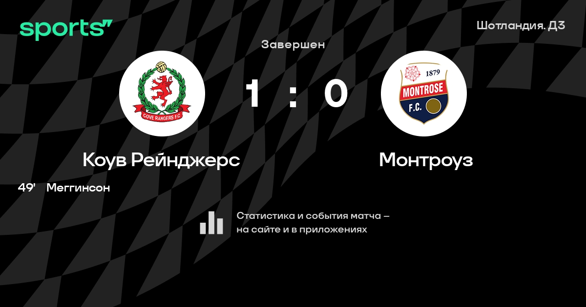 Результат прошлой игры в турнире «Лига 1»: Стенхаусмьюир – Коув Рейнджерс 3:2. После 4 туров Коув Рейнджерс набирает 1 очков и занимает 10 место в турнире. Лучший бомбардир команды – A. Emslie: он забил 2 в 4 матчах. Коув Рейнджерс не может выиграть в 4 последних матчах в рамках турнира «Лига 1». В 5 последних матчах в турнире «Лига 1» Коув Рейнджерс обязательно забивает. Коув Рейнджерс пропускает в 11 последних матчах в турнире «Лига 1». В последних 5 играх Коув Рейнджерс забивает 7 голов. В последних 5 играх Коув Рейнджерс пропускает 10 голов.