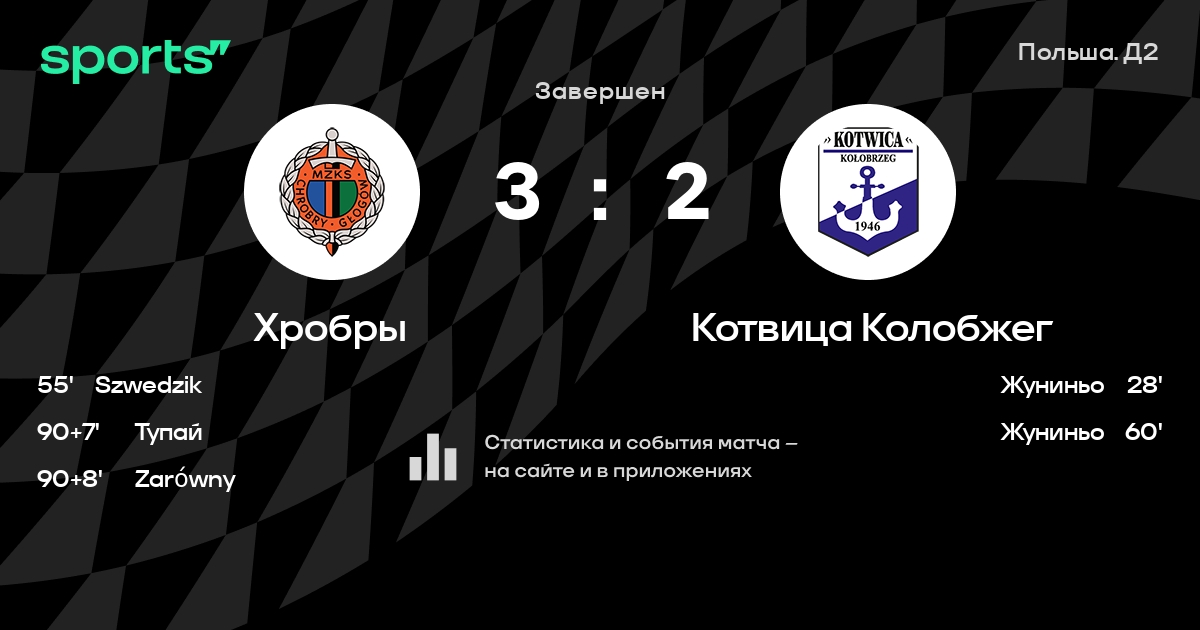 Результат прошлой игры в турнире «Первая лига»: Медзь – Хробры 1:0. После 12 туров Хробры набирает 9 очков и занимает 16 место в турнире. Лучший бомбардир команды – Матеуш Левандовски: он забил 4 в 5 матчах. Хробры не может выиграть в 3 последних матчах в рамках турнира «Первая лига». Хробры пропускает в 8 последних матчах в турнире «Первая лига». В последних 5 играх Хробры забивает 5 голов. В последних 5 играх Хробры пропускает 10 голов.
