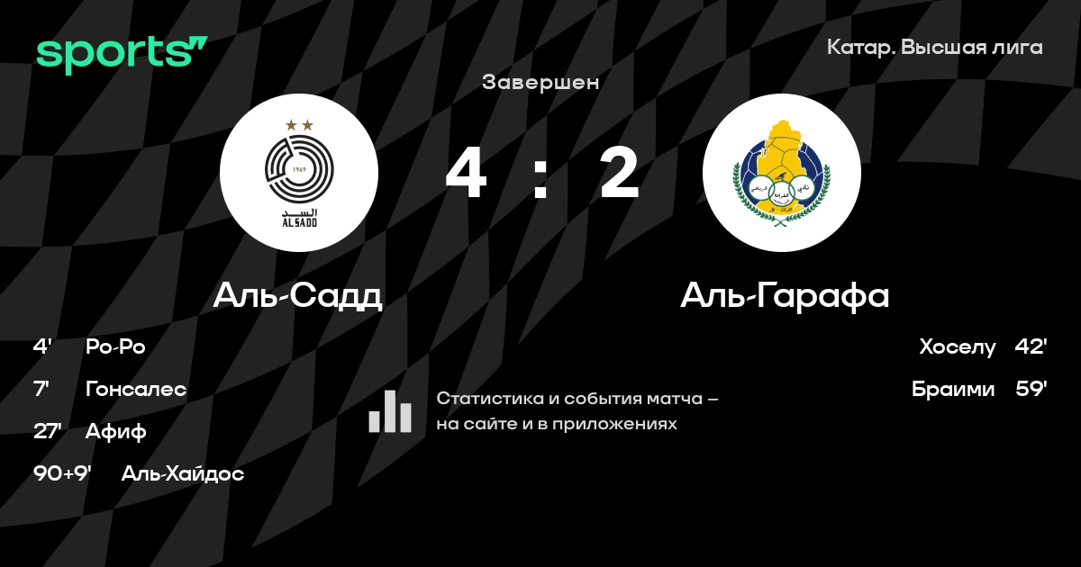 Результат прошлой игры в турнире «Высшая лига»: Катар – Аль-Гарафа 1:3. После 5 туров Аль-Гарафа набирает 8 очков и занимает 4 место в турнире. Лучший бомбардир команды – Ясин Браими: он забил 4 в 3 матчах. Аль-Гарафа не проигрывает в 3 последних матчах в рамках турнира «Высшая лига». В 3 последних матчах в турнире «Высшая лига» Аль-Гарафа обязательно забивает. Аль-Гарафа пропускает в 4 последних матчах в турнире «Высшая лига». В последних 5 играх Аль-Гарафа забивает 6 голов. В последних 5 играх Аль-Гарафа пропускает 7 голов.