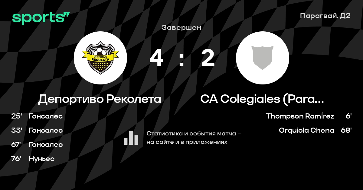 Результат прошлой игры в турнире «Сегунда»: Спортиво Сан-Лоренсо – CD Recoleta 0:0. После 21 туров CD Recoleta набирает 46 очков и занимает 2 место в турнире. Лучший бомбардир команды – Лукас Гонсалес: он забил 15 в 20 матчах. CD Recoleta не проигрывает в 6 последних матчах в рамках турнира «Сегунда». CD Recoleta имеет лучшую разницу мячей в турнире – 29. CD Recoleta больше всех забивает в турнире – 44 в 21. В последних 5 играх CD Recoleta забивает 8 голов. В последних 5 играх CD Recoleta пропускает 1 голов.
