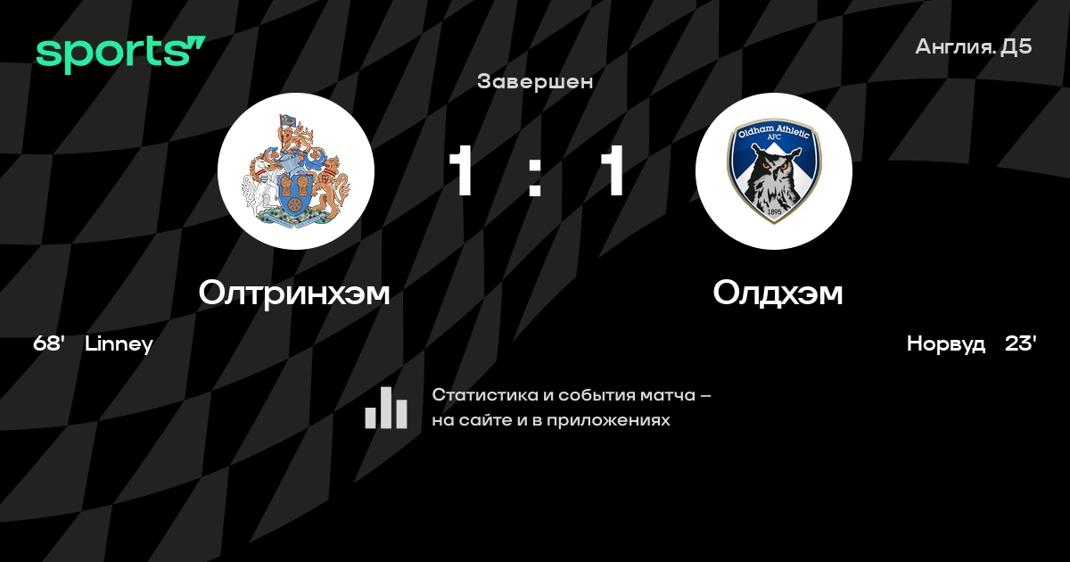Результат прошлой игры в турнире «Д5. Национальная лига»: Форест Грин – Олтринхэм 2:1. После 5 туров Олтринхэм набирает 6 очков и занимает 16 место в турнире. Лучший бомбардир команды – Джеймс Джонс: он забил 1 в 4 матчах. В последних 5 играх Олтринхэм забивает 3 голов. В последних 5 играх Олтринхэм пропускает 8 голов.