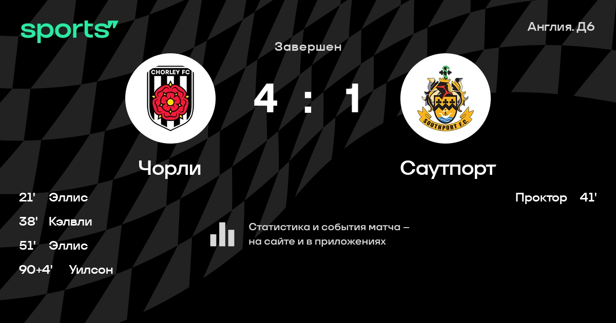 Результат прошлой игры в турнире «Д6. Национальная конференция»: Сканторп – Чорли 1:1. После 4 туров Чорли набирает 5 очков и занимает 15 место в турнире. Лучший бомбардир команды – Адам Блэйкман: он забил 1 в 2 матчах. Чорли не может выиграть в 3 последних матчах в рамках турнира «Д6. Национальная конференция». В 4 последних матчах в турнире «Д6. Национальная конференция» Чорли обязательно забивает. Чорли пропускает в 3 последних матчах в турнире «Д6. Национальная конференция». В последних 5 играх Чорли забивает 6 голов. В последних 5 играх Чорли пропускает 4 голов.