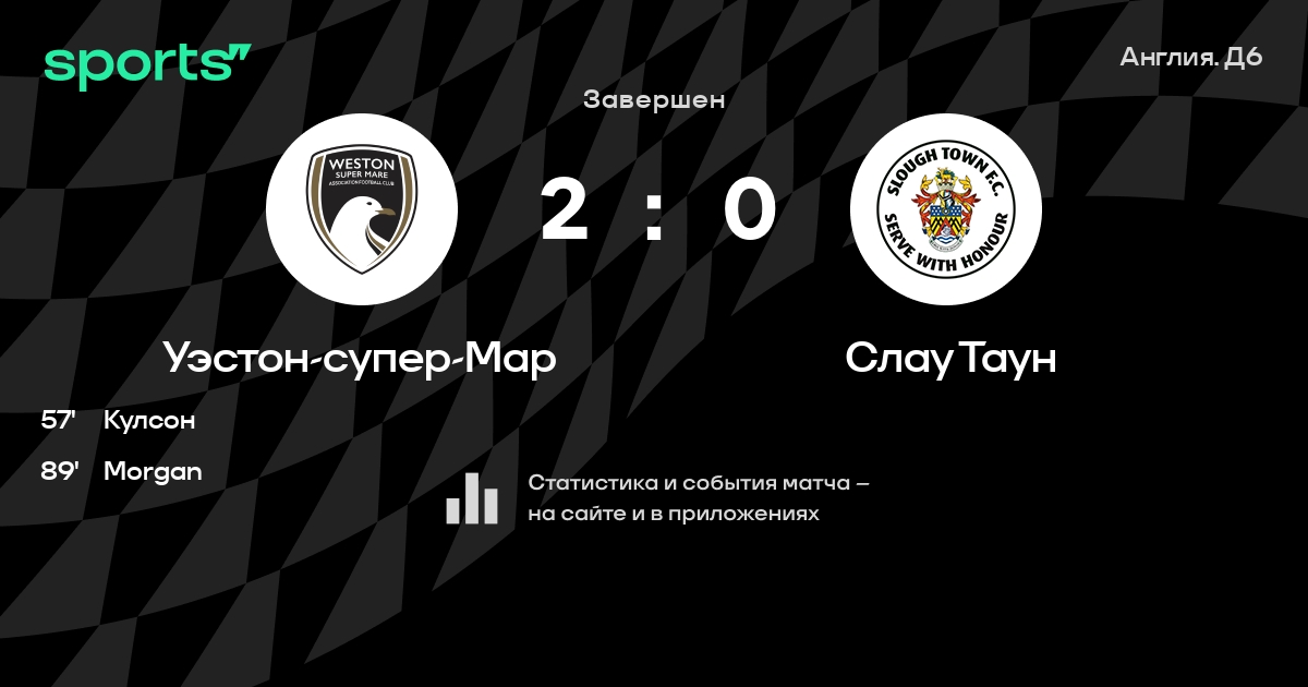 Результат прошлой игры в турнире «Д6. Национальная конференция»: Слау Таун – Уэймут 1:0. После 6 туров Слау Таун набирает 15 очков и занимает 2 место в турнире. Лучший бомбардир команды – Слави Спасов: он забил 4 в 4 матчах. Слау Таун побеждает в 4 последних матчах в рамках турнира «Д6. Национальная конференция». В 4 последних матчах в турнире «Д6. Национальная конференция» Слау Таун обязательно забивает. В последних 5 играх Слау Таун забивает 12 голов. В последних 5 играх Слау Таун пропускает 3 голов.