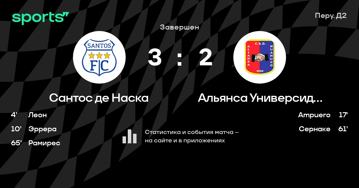 Результат прошлой игры в турнире «Сегунда»: Депортиво Льякуабамба – Сантос де Наска 5:1. После 7 туров Сантос де Наска набирает 9 очков и занимает 2 место в турнире. Лучший бомбардир команды – Хосуэ Эррера: он забил 8 в 19 матчах. В 9 последних матчах в турнире «Сегунда» Сантос де Наска обязательно забивает. Сантос де Наска пропускает в 10 последних матчах в турнире «Сегунда». В последних 5 играх Сантос де Наска забивает 7 голов. В последних 5 играх Сантос де Наска пропускает 12 голов.