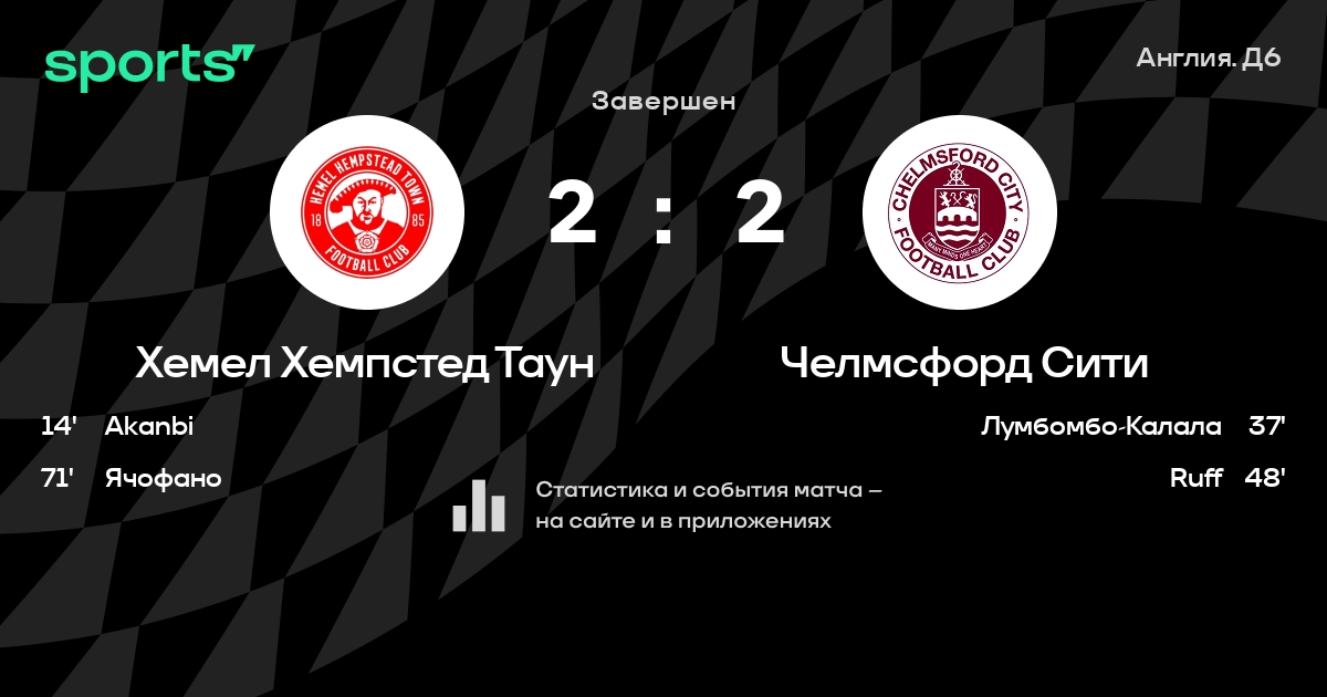 Результат прошлой игры в турнире «Д6. Национальная конференция»: Чиппенхэм Таун – Хемел Хемпстед Таун 3:0. После 12 туров Хемел Хемпстед Таун набирает 21 очков и занимает 6 место в турнире. Лучший бомбардир команды – Рики Герман: он забил 5 в 10 матчах. Хемел Хемпстед Таун проигрывает в 3 последних матчах в рамках турнира «Д6. Национальная конференция». Хемел Хемпстед Таун пропускает в 4 последних матчах в турнире «Д6. Национальная конференция». В последних 5 играх Хемел Хемпстед Таун забивает 5 голов. В последних 5 играх Хемел Хемпстед Таун пропускает 11 голов.