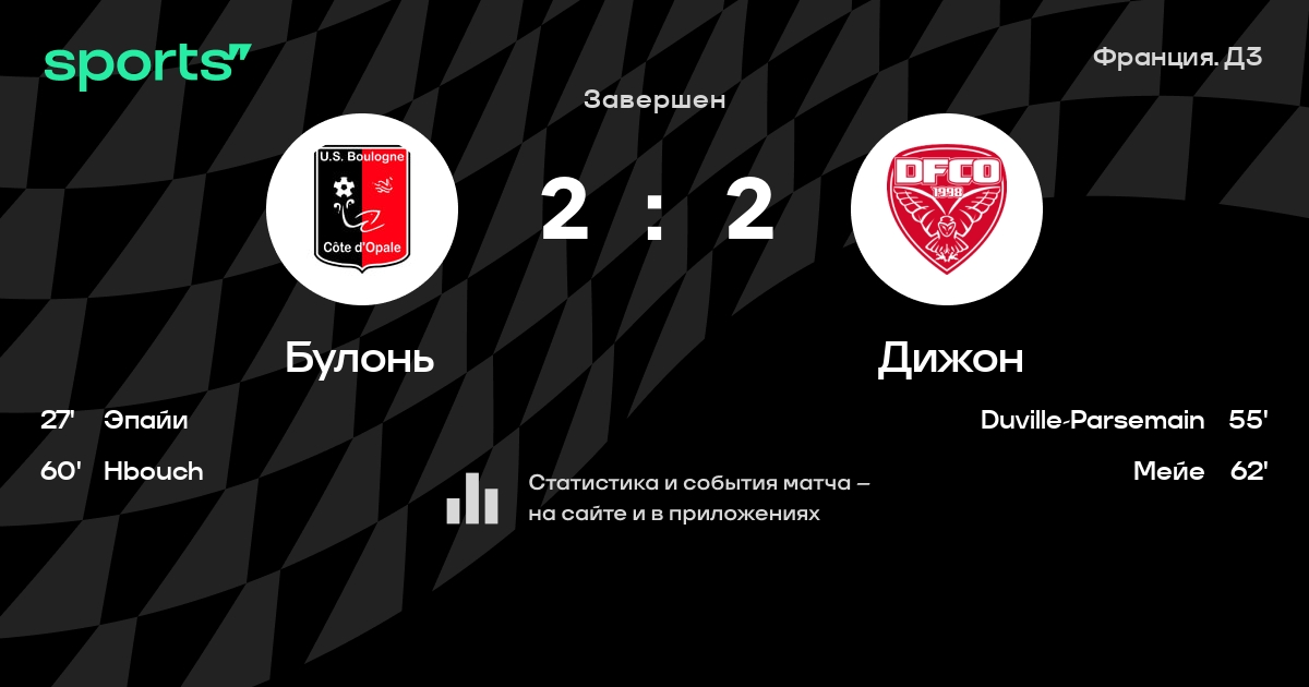Результат прошлой игры в турнире «Насьональ»: Дижон – Шатору 4:0. После 15 туров Дижон набирает 25 очков и занимает 4 место в турнире. Лучший бомбардир команды – A. Duville-Parsemain: он забил 5 в 17 матчах. В последних 5 играх Дижон забивает 7 голов. В последних 5 играх Дижон пропускает 2 голов.