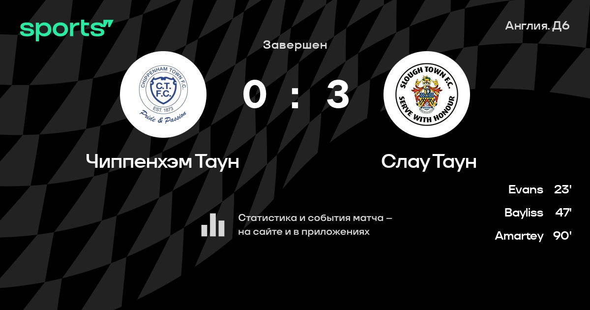 Результат прошлой игры в турнире «Д6. Национальная конференция»: Сент-Олбанс Сити – Чиппенхэм Таун 0:2. После 18 туров Чиппенхэм Таун набирает 25 очков и занимает 11 место в турнире. Лучший бомбардир команды – Харри Парсонс: он забил 6 в 18 матчах. Чиппенхэм Таун не проигрывает в 4 последних матчах в рамках турнира «Д6. Национальная конференция». В 4 последних матчах в турнире «Д6. Национальная конференция» Чиппенхэм Таун обязательно забивает. В последних 5 играх Чиппенхэм Таун забивает 10 голов. В последних 5 играх Чиппенхэм Таун пропускает 3 голов.