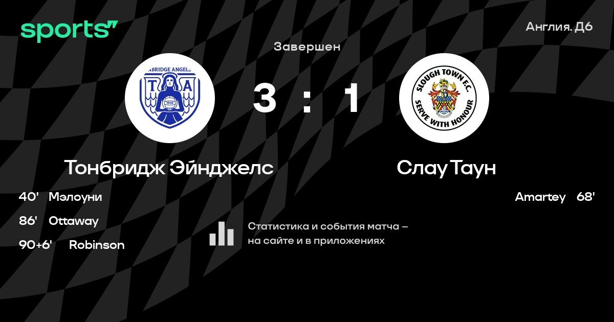 Результат прошлой игры в турнире «Д6. Национальная конференция»: Хэмптон энд Ричмонд – Тонбридж Эйнджелс 2:0. После 26 туров Тонбридж Эйнджелс набирает 39 очков и занимает 9 место в турнире. Лучший бомбардир команды – Шон Шилдс: он забил 9 в 24 матчах. Тонбридж Эйнджелс не может выиграть в 3 последних матчах в рамках турнира «Д6. Национальная конференция». Тонбридж Эйнджелс пропускает в 3 последних матчах в турнире «Д6. Национальная конференция». В последних 5 играх Тонбридж Эйнджелс забивает 4 голов. В последних 5 играх Тонбридж Эйнджелс пропускает 8 голов.