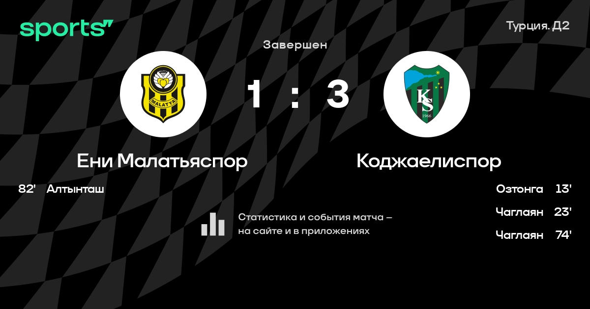 Результат прошлой игры в турнире «Первая лига»: Бандырмаспор – Ени Малатьяспор 2:0. После 14 туров Ени Малатьяспор набирает -3 очков и занимает 20 место в турнире. Лучший бомбардир команды – Мерт Мирач Алтынташ: он забил 2 в 13 матчах. Ени Малатьяспор проигрывает в 14 последних матчах в рамках турнира «Первая лига». Коджаелиспор имеет в активе больше всех побед в турнире – 9. Ени Малатьяспор пропускает в 14 последних матчах в турнире «Первая лига». В последних 5 играх Ени Малатьяспор забивает 2 голов. В последних 5 играх Ени Малатьяспор пропускает 16 голов.