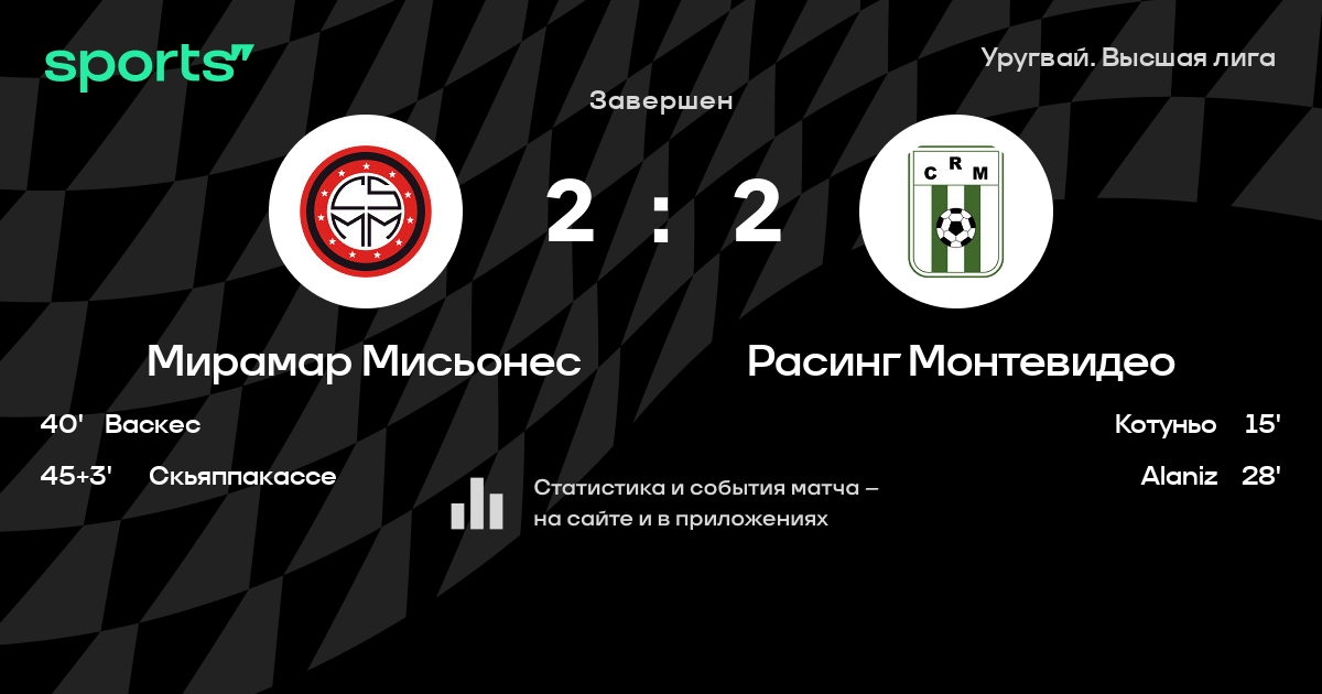 Результат прошлой игры в турнире «Примера»: Серро – Мирамар Мисьонес 0:1. После 6 туров Мирамар Мисьонес набирает 9 очков и занимает 9 место в турнире. Лучший бомбардир команды – Александер Мачадо: он забил 10 в 21 матчах. Мирамар Мисьонес не проигрывает в 4 последних матчах в рамках турнира «Примера». Мирамар Мисьонес не пропускает в 3 последних матчах в турнире «Примера». В последних 5 играх Мирамар Мисьонес забивает 4 голов. В последних 5 играх Мирамар Мисьонес пропускает 3 голов.