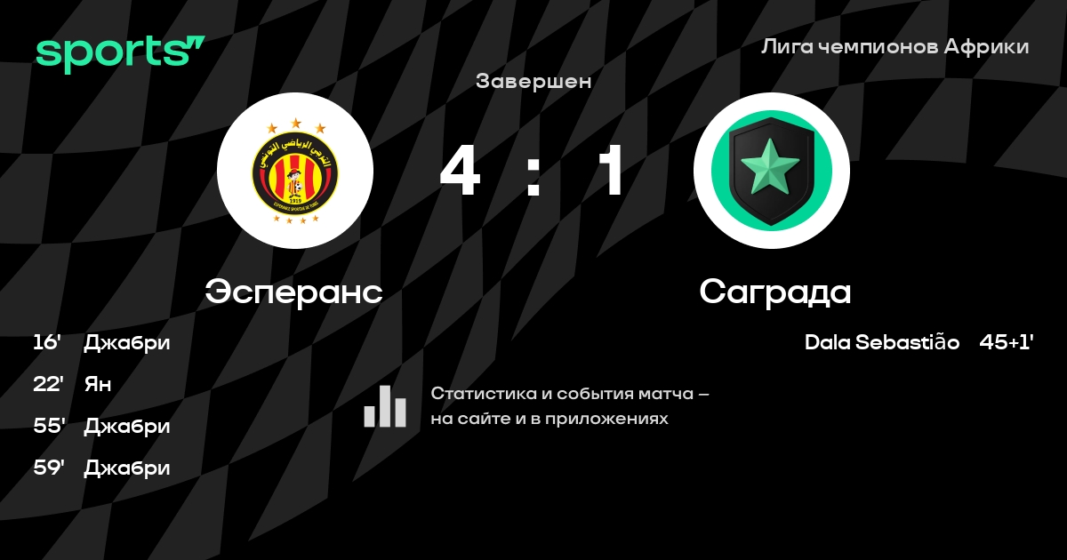 Результат прошлой игры в турнире «Лига чемпионов Африки»: Sagrada Esperança – Пирамидс 0:1. После 5 туров Sagrada Esperança набирает 5 очков и занимает 3 место в турнире. Лучший бомбардир команды – Mussá: он забил 1 в 4 матчах. В последних 5 играх Sagrada Esperança забивает 1 голов. В последних 5 играх Sagrada Esperança пропускает 4 голов.