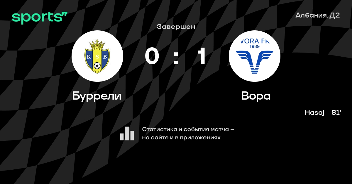 Результат прошлой игры в турнире «Первая лига»: Эрзени – Буррели 0:2. После 20 туров Буррели набирает 34 очков и занимает 4 место в турнире. Лучший бомбардир команды – F. Ferruku: он забил 10 в 19 матчах. Вора имеет в активе больше всех побед в турнире – 15. В последних 5 играх Буррели забивает 7 голов. В последних 5 играх Буррели пропускает 3 голов.