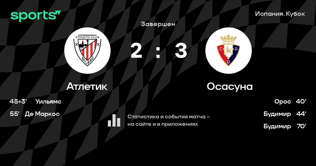 Агирресабала - Берчиче, Паредес, Вивиан, Де Маркос - Хаурегисар, Руис де Галаррета, Н. Уильямс, Беренгер, И. Уильямс - ГурусетаЗапасные: Унаи Симон, Горосабель, Йерай Альварес, Нуньес, Лекуэ, Весга, Унаи Гомес, Прадос, Джало, Мартон, Серрано