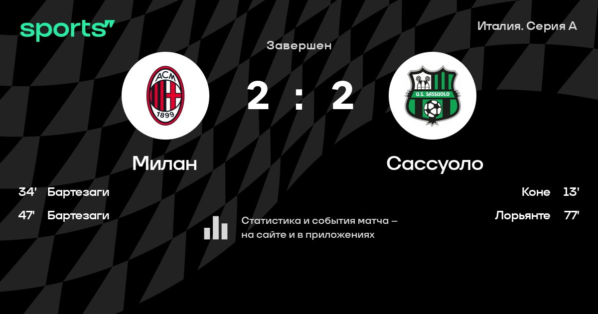 Серия А: шансы «Милана» и «Сассуоло» на победу в матче 15-го тура чемпионата Италии