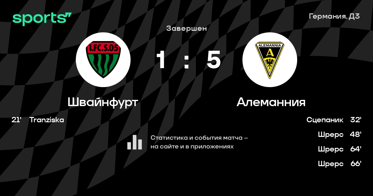 Результат прошлой игры в турнире «Третья лига»: Саарбрюкен – Швайнфурт 2:1. После 7 туров Швайнфурт набирает 3 очков и занимает 20 место в турнире. Лучший бомбардир команды – Мануэль Винцхаймер: он забил 2 в 7 матчах. Швайнфурт пропускает в 7 последних матчах в турнире «Третья лига». В последних 5 играх Швайнфурт забивает 4 голов. В последних 5 играх Швайнфурт пропускает 11 голов.
