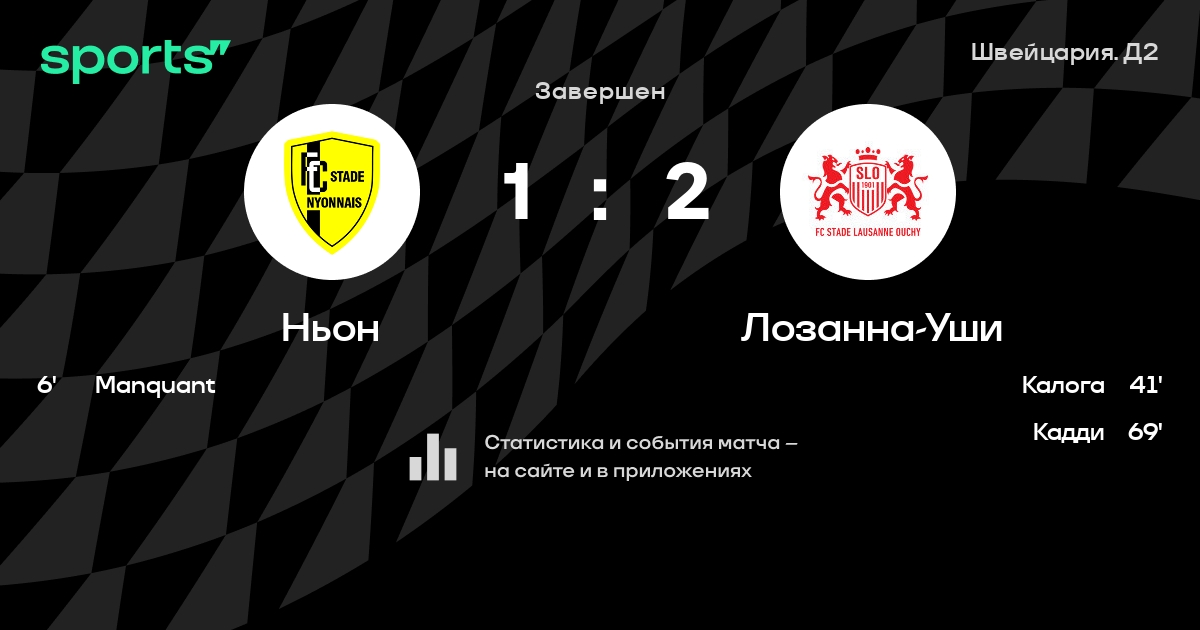 Результат прошлой игры в турнире «Челлендж-лига»: Ньон – Беллинцона 3:1. После 6 туров Ньон набирает 8 очков и занимает 5 место в турнире. Лучший бомбардир команды – J. Manquant: он забил 6 в 7 матчах. В 3 последних матчах в турнире «Челлендж-лига» Ньон обязательно забивает. Ньон пропускает в 4 последних матчах в турнире «Челлендж-лига». В последних 5 играх Ньон забивает 12 голов. В последних 5 играх Ньон пропускает 10 голов.