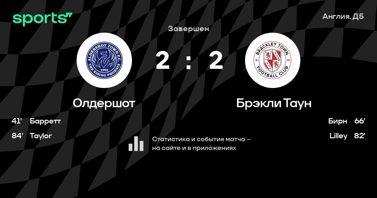 Результат прошлой игры в турнире «Д5. Национальная лига»: Труро Сити – Олдершот 2:2. После 7 туров Олдершот набирает 8 очков и занимает 12 место в турнире. Лучший бомбардир команды – R. Hill: он забил 4 в 7 матчах. Олдершот не проигрывает в 4 последних матчах в рамках турнира «Д5. Национальная лига». В 8 последних матчах в турнире «Д5. Национальная лига» Олдершот обязательно забивает. Олдершот больше всех забивает в турнире – 20 в 7. В последних 5 играх Олдершот забивает 16 голов. В последних 5 играх Олдершот пропускает 9 голов.