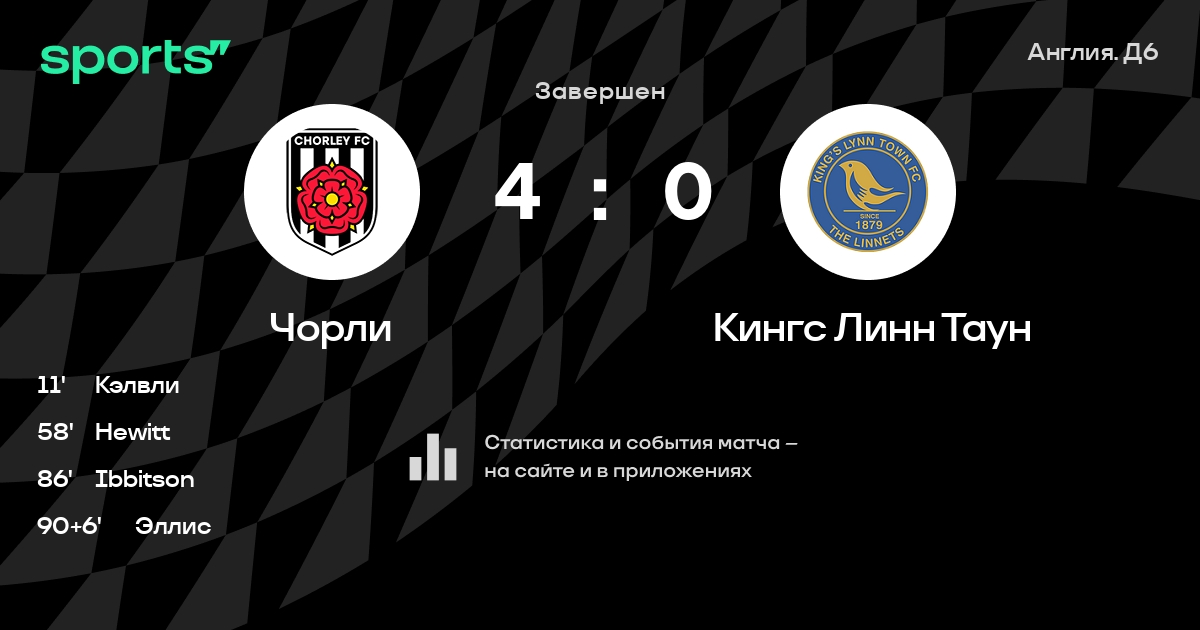 Результат прошлой игры в турнире «Д6. Национальная конференция»: Херефорд – Чорли 1:4. После 4 туров Чорли набирает 10 очков и занимает 2 место в турнире. Лучший бомбардир команды – T. Carr: он забил 2 в 2 матчах. Чорли не проигрывает в 4 последних матчах в рамках турнира «Д6. Национальная конференция». В 8 последних матчах в турнире «Д6. Национальная конференция» Чорли обязательно забивает. Чорли больше всех забивает в турнире – 12 в 4. В последних 5 играх Чорли забивает 12 голов. В последних 5 играх Чорли пропускает 6 голов.