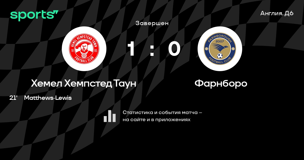 Результат прошлой игры в турнире «Д6. Национальная конференция»: Истборн – Хемел Хемпстед Таун 0:0. После 8 туров Хемел Хемпстед Таун набирает 13 очков и занимает 6 место в турнире. Лучший бомбардир команды – Джо Уайт: он забил 3 в 6 матчах. Хемел Хемпстед Таун не проигрывает в 3 последних матчах в рамках турнира «Д6. Национальная конференция». В последних 5 играх Хемел Хемпстед Таун забивает 7 голов. В последних 5 играх Хемел Хемпстед Таун пропускает 4 голов.