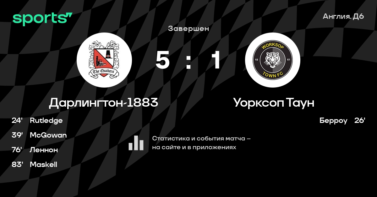 Результат прошлой игры в турнире «Д6. Национальная конференция»: ФК Мертир Таун – Дарлингтон-1883 3:1. После 14 туров Дарлингтон-1883 набирает 16 очков и занимает 15 место в турнире. Лучший бомбардир команды – J. Maskell: он забил 5 в 12 матчах. В 4 последних матчах в турнире «Д6. Национальная конференция» Дарлингтон-1883 обязательно забивает. В последних 5 играх Дарлингтон-1883 забивает 5 голов. В последних 5 играх Дарлингтон-1883 пропускает 12 голов.