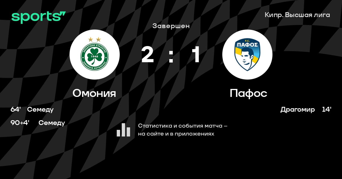 Результат прошлой игры в турнире «Лига 1»: Красава Ипсонас – Омония 1:2. После 7 туров Омония набирает 16 очков и занимает 3 место в турнире. Лучший бомбардир команды – Вилли Семеду: он забил 9 в 9 матчах. Омония не проигрывает в 6 последних матчах в рамках турнира «Лига 1». Пафос имеет в активе больше всех побед в турнире – 6. Омония имеет лучшую разницу мячей в турнире – 14. Омония больше всех забивает в турнире – 17 в 7. В последних 5 играх Омония забивает 8 голов. В последних 5 играх Омония пропускает 3 голов.