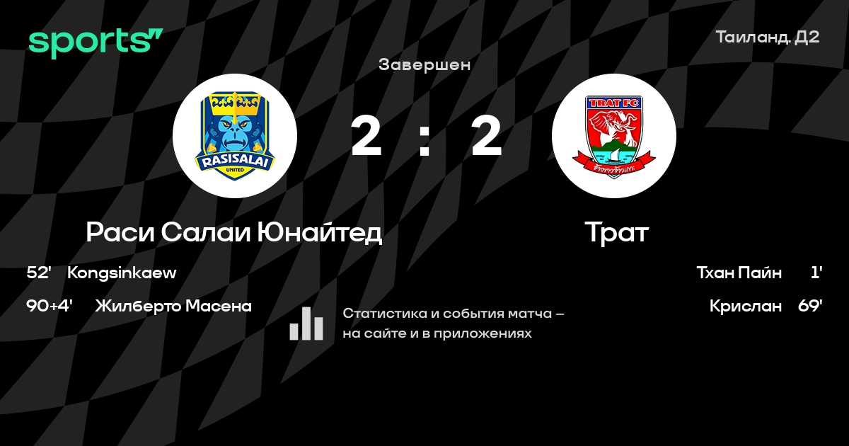 Результат прошлой игры в турнире «Лига 2»: Паттайя Юнайтед – Раси Салаи Юнайтед 1:4. После 10 туров Раси Салаи Юнайтед набирает 24 очков и занимает 1 место в турнире. Лучший бомбардир команды – Alberto Moreira: он забил 6 в 10 матчах. Раси Салаи Юнайтед не проигрывает в 10 последних матчах в рамках турнира «Лига 2». Раси Салаи Юнайтед имеет в активе больше всех побед в турнире – 7. Раси Салаи Юнайтед имеет лучшую разницу мячей в турнире – 12. В 10 последних матчах в турнире «Лига 2» Раси Салаи Юнайтед обязательно забивает. Раси Салаи Юнайтед пропускает в 5 последних матчах в турнире «Лига 2». В последних 5 играх Раси Салаи Юнайтед забивает 12 голов. В последних 5 играх Раси Салаи Юнайтед пропускает 6 голов.