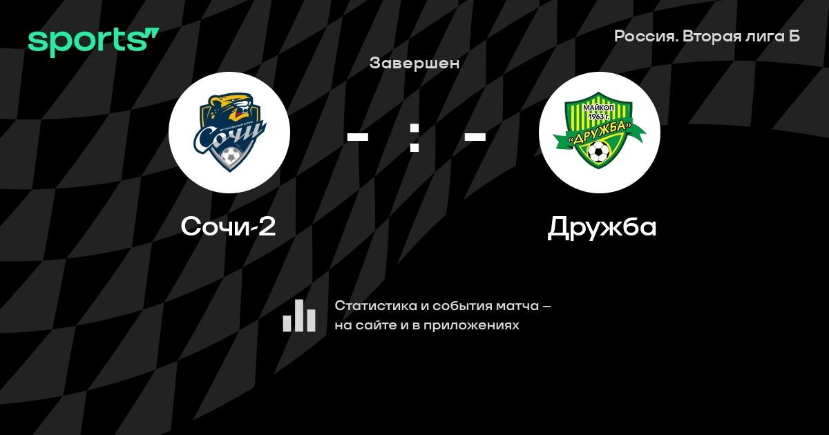 Результат прошлой игры в турнире «Вторая лига»: Сочи-2 – Динамо-2 Махачкала 0:0. После 26 туров Сочи-2 набирает 40 очков и занимает 7 место в турнире. В последних 5 играх Сочи-2 забивает 10 голов. В последних 5 играх Сочи-2 пропускает 3 голов.