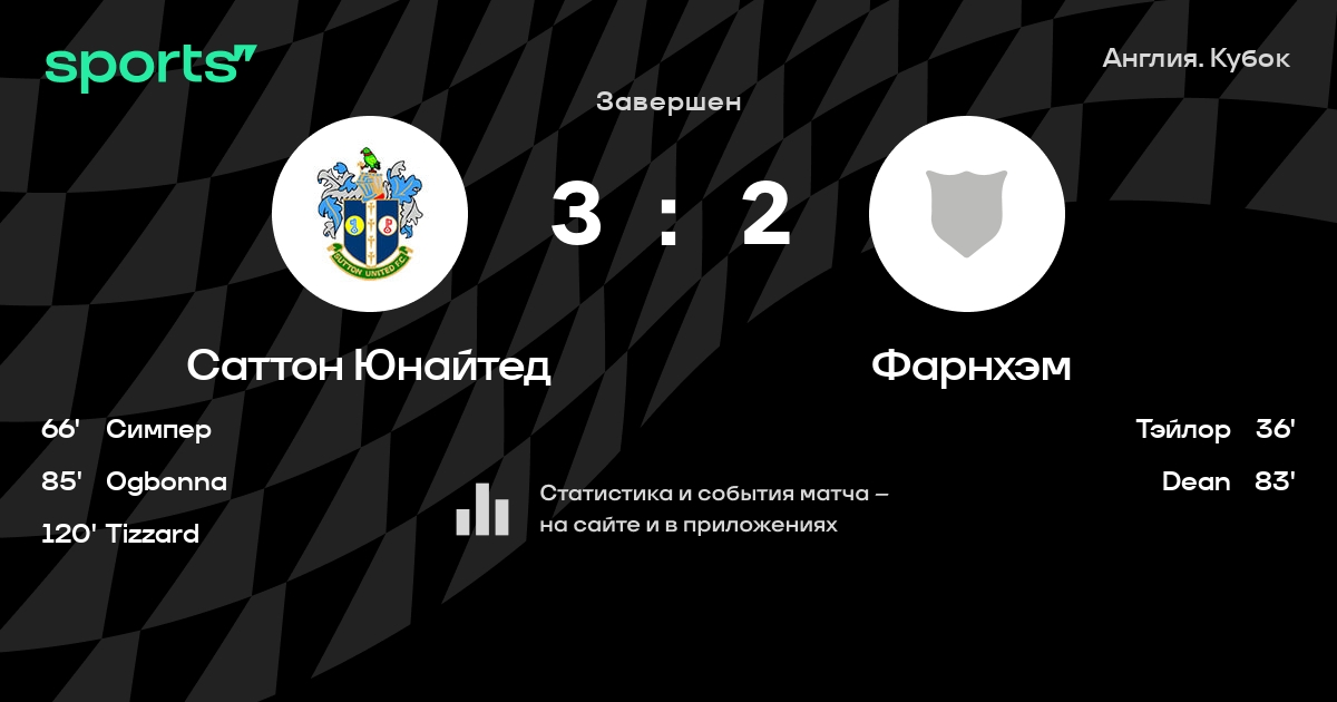 Результат прошлой игры в турнире «Кубок»: Фарнхэм – Саттон Юнайтед 3:3. В последних 5 играх Саттон Юнайтед забивает 6 голов. В последних 5 играх Саттон Юнайтед пропускает 7 голов.