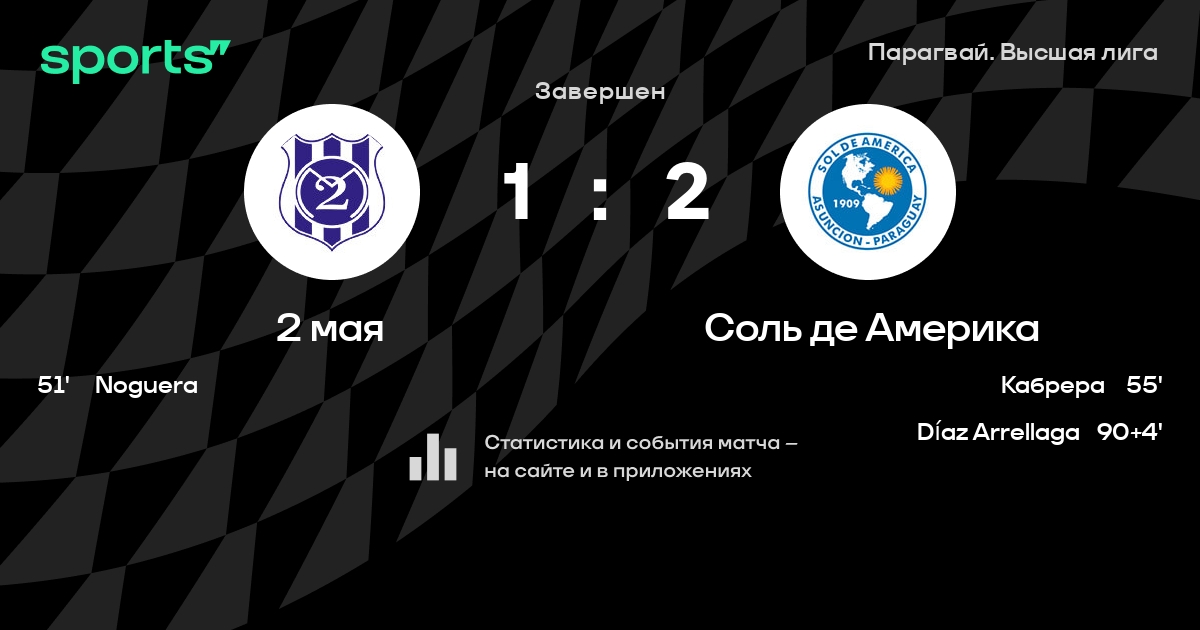 Результат прошлой игры в турнире «Примера»: 2 мая – Хенераль Кабальеро ХЛМ 0:2. После 22 туров 2 мая набирает 31 очков и занимает 6 место в турнире. Лучший бомбардир команды – Уилсон Айяла: он забил 9 в 27 матчах. 2 мая пропускает в 5 последних матчах в турнире «Примера». В последних 5 играх 2 мая забивает 5 голов. В последних 5 играх 2 мая пропускает 9 голов.