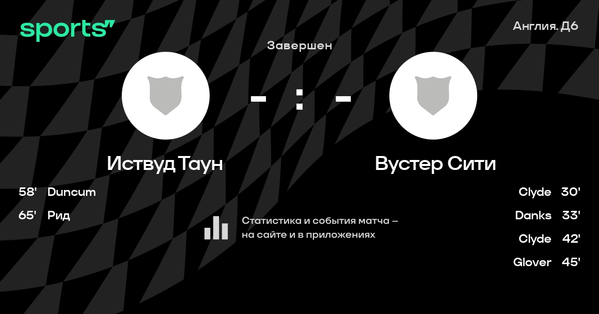 Sandercombe - Khan, Clyde, Elvins - Cartwright, Thorley, Birley, Ward, О`Коннор - Glover, DanksЗапасные: , Evans, Richman, Прайс, Walker