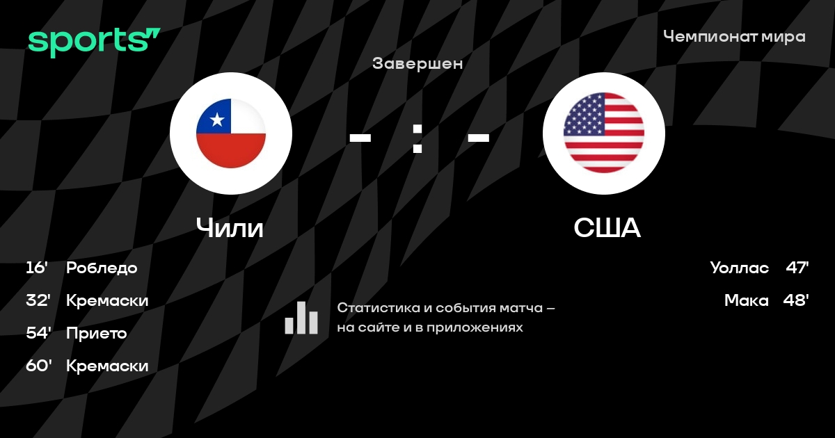 Ливингстон - Мачука, Альварес, Фариас - Бускетс, Рохас - Робледо, Ибаньес, Прието, Риера, КремаскиЗапасные: Quitral Encina, Рольдан, Urroz Martínez, Flores Espinoza, Карвальо, Sáez Álvarez, Campos Quiroz, Диас, Муньос, Майянес, Infante Rencoret
