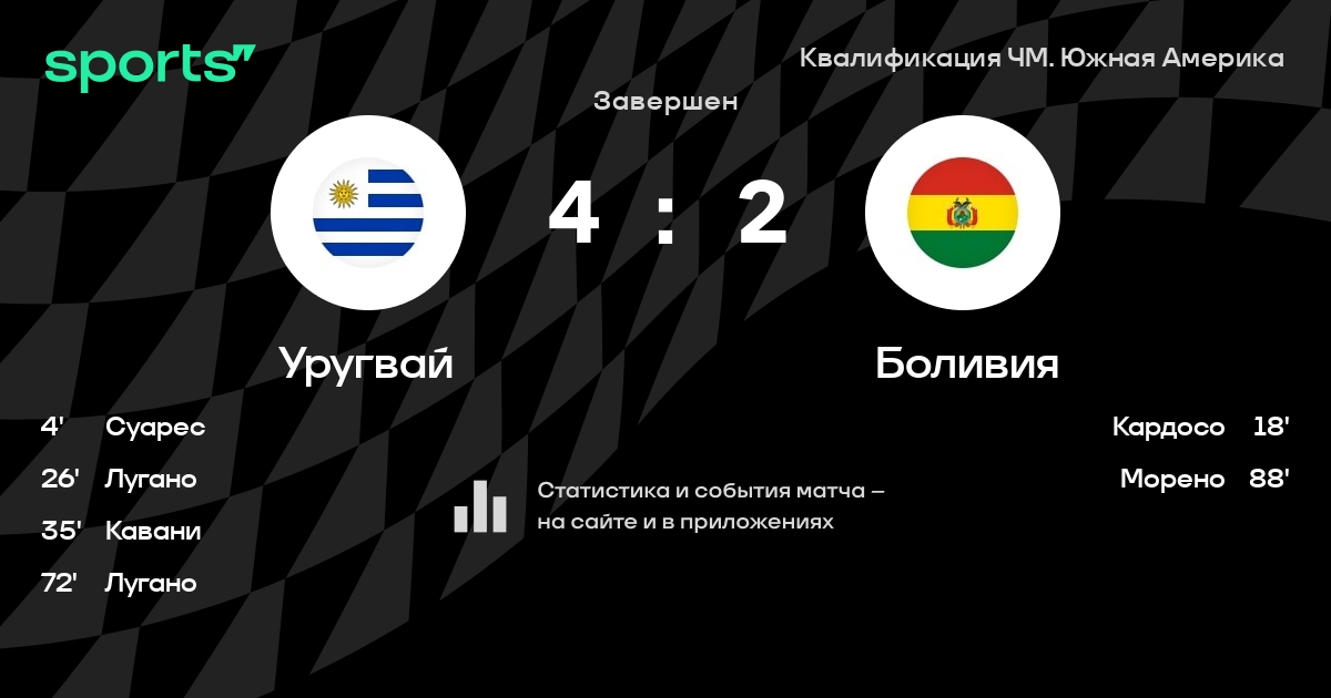 Муслера - Лугано, Годин, Макси Перейра, Касерес, Перейра - Аревало, Перес - Кавани, Форлан, СуаресЗапасные: Сильва, Фусиле, Коатес, Скотти, Гаргано, Родригес, Рамирес, Гонсалес, Эрнандес