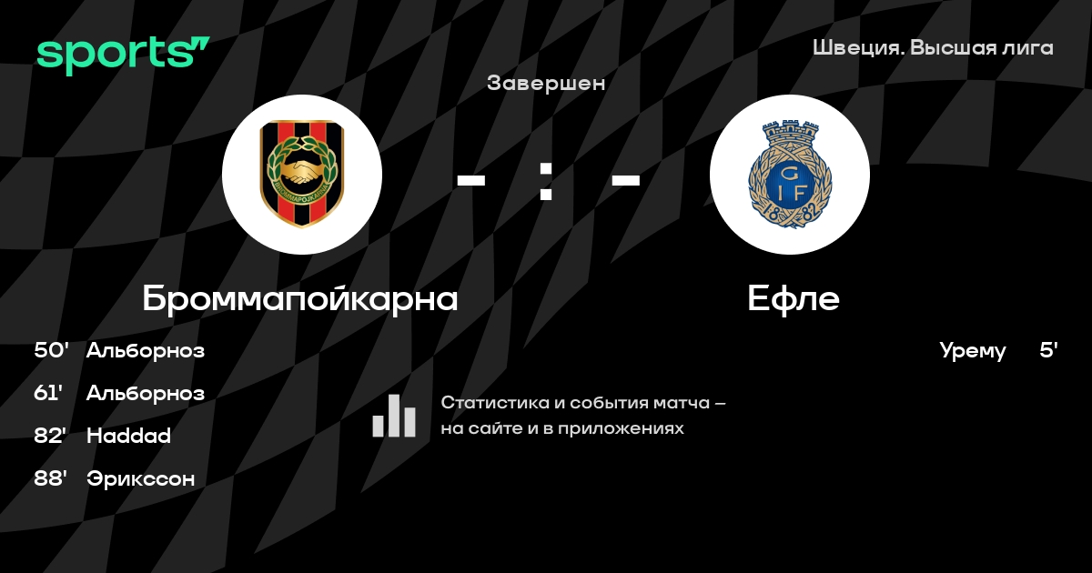 Westberg - Уне-Ларссон, Бьоркстрем, Линднер - Димитриадис, Эрикссон, Альборноз, Джорджич, Петрович - Беркрот, HaddadЗапасные: Вазгеч, Jönsson, Фалькеборн, Осбринк, Саннберг-Магнуссон, Седерстрем, Tronet