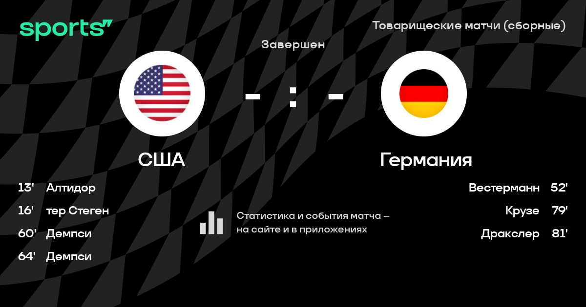 тер Стеген - Янсен, Хеведес, Мертесакер, Бендер - Подольски, Райнартц, Бендер, Дракслер, Шюррле - КлозеЗапасные: Адлер, Цилер, Волльшайд, Аого, Нойштедтер, Хунт, Мюллер, Крузе