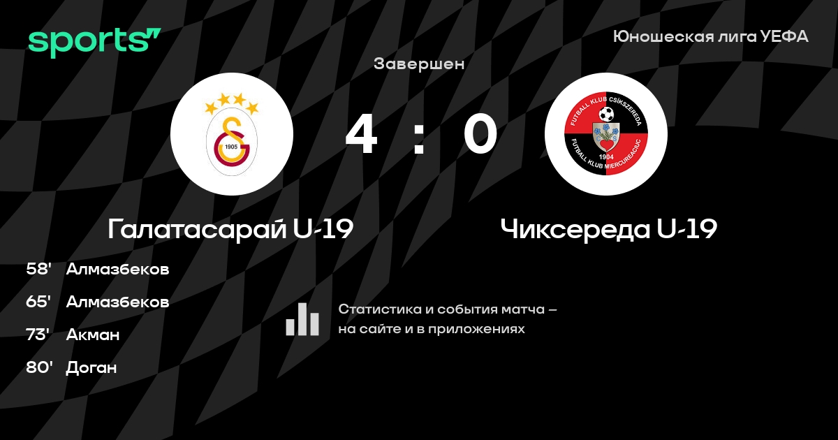Результат прошлой игры в турнире «Юношеская лига УЕФА»: Чиксереда U-19 – Галатасарай U-19 1:1. В последних 5 играх Галатасарай U-19 забивает 7 голов. В последних 5 играх Галатасарай U-19 пропускает 6 голов.