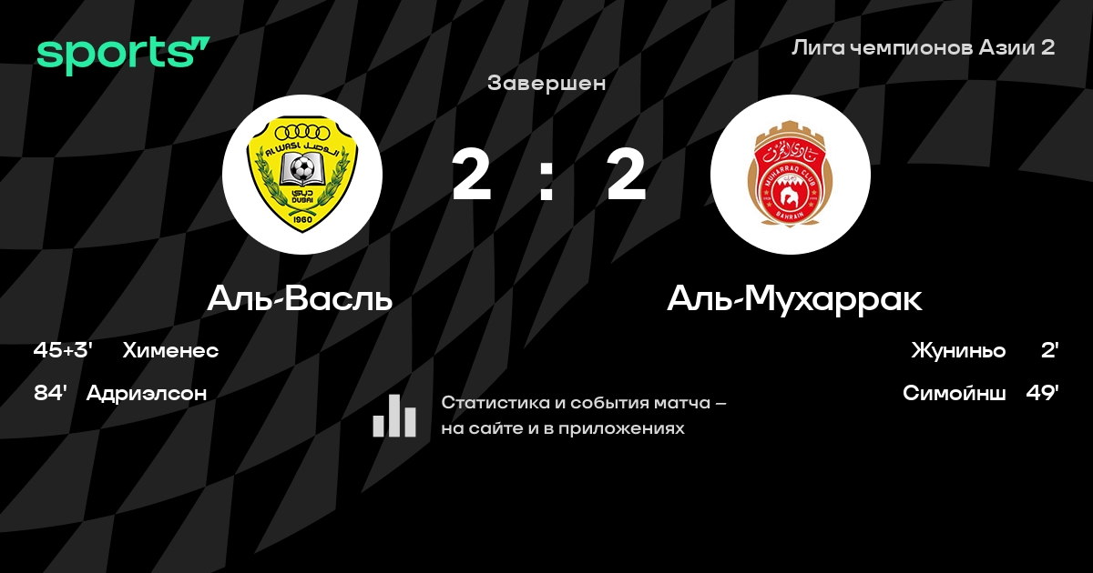 Результат прошлой игры в турнире «Лига чемпионов Азии 2»: Аль-Мухаррак – Аль-Васль 0:1. После 3 туров Аль-Васль набирает 9 очков и занимает 1 место в турнире. Лучший бомбардир команды – Фабио Лима: он забил 7 в 9 матчах. Аль-Васль побеждает в 3 последних матчах в рамках турнира «Лига чемпионов Азии 2». В 3 последних матчах в турнире «Лига чемпионов Азии 2» Аль-Васль обязательно забивает. Аль-Васль больше всех забивает в турнире – 10 в 3. В последних 5 играх Аль-Васль забивает 8 голов. В последних 5 играх Аль-Васль пропускает 5 голов.