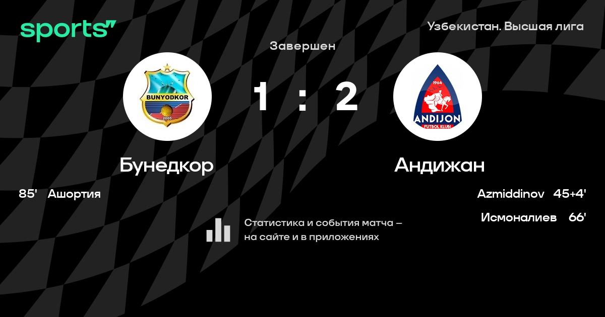 Результат прошлой игры в турнире «ПФЛ»: Согдиана – Бунедкор 0:2. После 29 туров Бунедкор набирает 49 очков и занимает 5 место в турнире. Лучший бомбардир команды – Имеда Ашортия: он забил 7 в 29 матчах. В 23 последних матчах в турнире «ПФЛ» Бунедкор обязательно забивает. В последних 5 играх Бунедкор забивает 9 голов. В последних 5 играх Бунедкор пропускает 8 голов.
