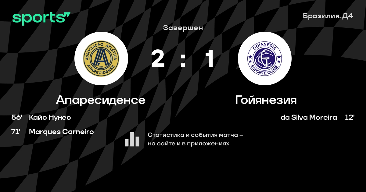 Результат прошлой игры в турнире «Серия D»: Апаресиденсе – Порту-Велью 7:0. После 11 туров Апаресиденсе набирает 25 очков и занимает 1 место в турнире. Лучший бомбардир команды – Игор: он забил 6 в 16 матчах. Апаресиденсе побеждает в 3 последних матчах в рамках турнира «Серия D». Апаресиденсе имеет в активе больше всех побед в турнире – 8. Апаресиденсе имеет лучшую разницу мячей в турнире – 18. В 9 последних матчах в турнире «Серия D» Апаресиденсе обязательно забивает. Апаресиденсе не пропускает в 3 последних матчах в турнире «Серия D». Апаресиденсе больше всех забивает в турнире – 28 в 11. В последних 5 играх Апаресиденсе забивает 17 голов. В последних 5 играх Апаресиденсе пропускает 4 голов.