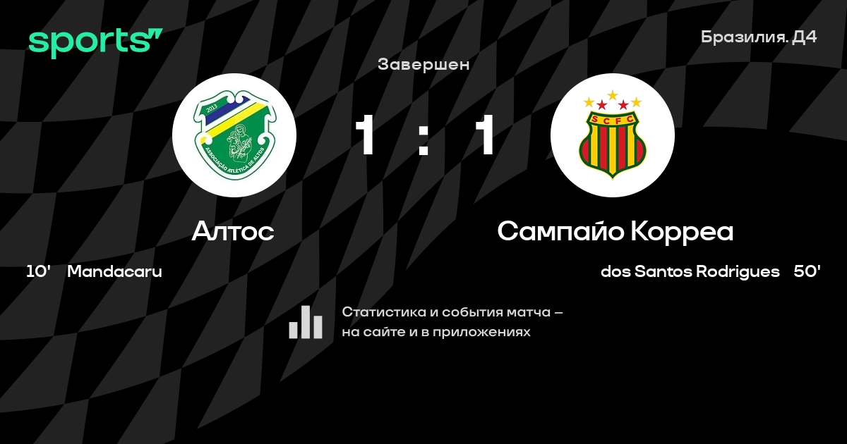 Результат прошлой игры в турнире «Серия D»: Сампайо Корреа – Алтос 2:2. После 7 туров Алтос набирает 13 очков и занимает 2 место в турнире. Лучший бомбардир команды – Leandro: он забил 4 в 15 матчах. Алтос не проигрывает в 7 последних матчах в рамках турнира «Серия D». В 8 последних матчах в турнире «Серия D» Алтос обязательно забивает. Алтос пропускает в 3 последних матчах в турнире «Серия D». В последних 5 играх Алтос забивает 9 голов. В последних 5 играх Алтос пропускает 5 голов.