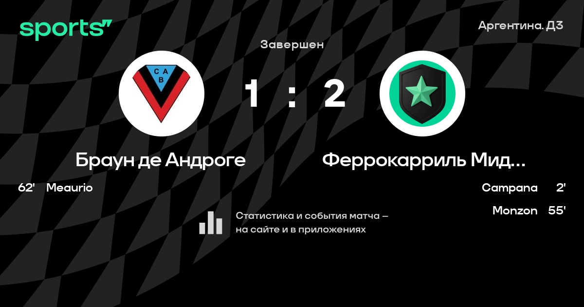 Результат прошлой игры в турнире «Примера B»: Экскурсьонистас – Браун де Андроге 0:2. После 20 туров Браун де Андроге набирает 28 очков и занимает 8 место в турнире. Лучший бомбардир команды – Хонатан Каньете: он забил 7 в 21 матчах. Феррокарриль Мидланд имеет в активе больше всех побед в турнире – 11. В последних 5 играх Браун де Андроге забивает 7 голов. В последних 5 играх Браун де Андроге пропускает 4 голов.