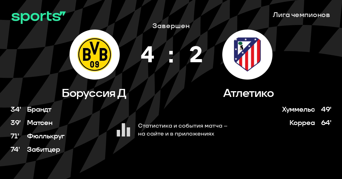 Лига Чемпионов (1/4 финала, 1-й матч): «Атлетико» Мадрид — «Боруссия» Дортмунд. Все решится в Дортмунде