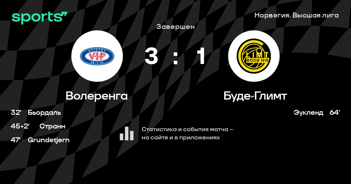 Результат прошлой игры в турнире «Высшая лига»: Волеренга – Стремсгодсет 2:1. После 26 туров Волеренга набирает 37 очков и занимает 6 место в турнире. Лучший бомбардир команды – Элиас Соренсен: он забил 12 в 24 матчах. Буде-Глимт имеет в активе больше всех побед в турнире – 19. В 12 последних матчах в турнире «Высшая лига» Волеренга обязательно забивает. В последних 5 играх Волеренга забивает 6 голов. В последних 5 играх Волеренга пропускает 9 голов.