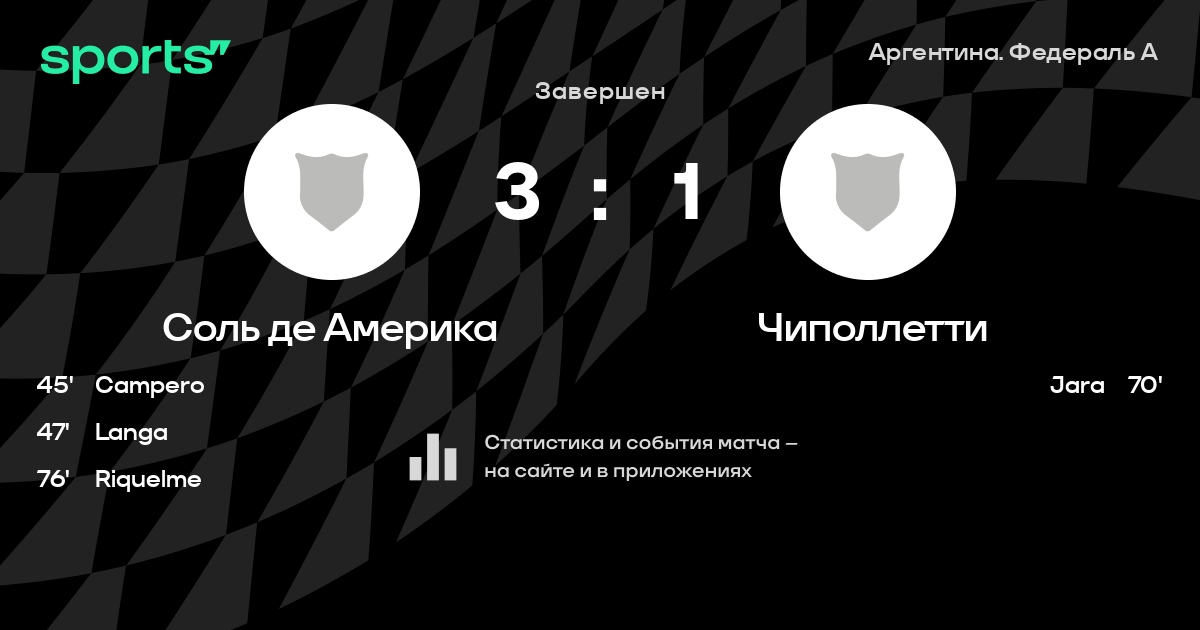 Результат прошлой игры в турнире «Торнео Федераль A»: Чиполлетти – Соль де Америка 0:0. В последних 5 играх Соль де Америка забивает 4 голов. В последних 5 играх Соль де Америка пропускает 2 голов.