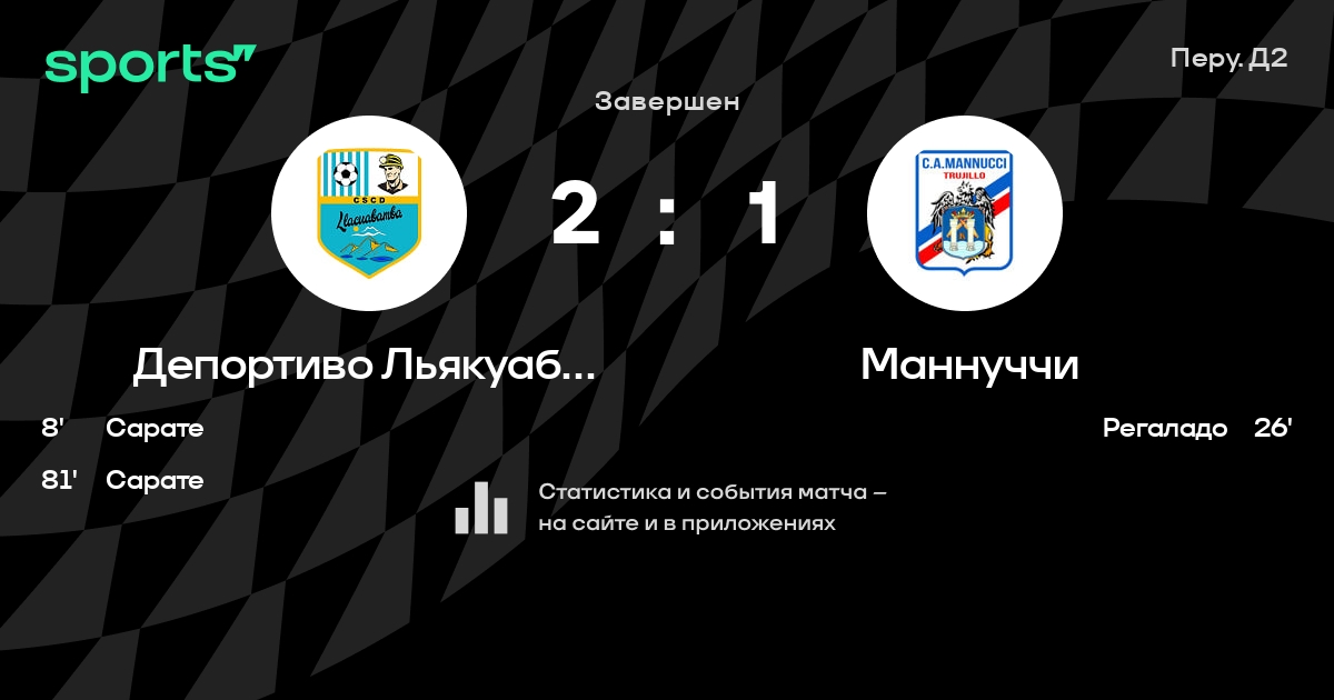 Результат прошлой игры в турнире «Сегунда»: Сан-Маркос – Депортиво Льякуабамба 3:0. После 8 туров Депортиво Льякуабамба набирает 10 очков и занимает 6 место в турнире. Лучший бомбардир команды – J. Torres: он забил 3 в 8 матчах. В последних 5 играх Депортиво Льякуабамба забивает 7 голов. В последних 5 играх Депортиво Льякуабамба пропускает 8 голов.