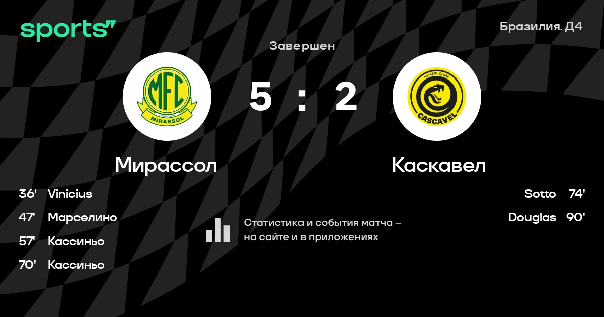Жеферсон - dos Santos Júnior, Марселино, Baracioli Maciel, Данило - Кассиньо, Даниэл, Fernandes Gomes Junior - Фабрисио Даниэл, Лукас Силва, НеттоЗапасные: Фелипе, Алиссон, Pena de Oliveira, Игор Энрике, Алисон, Морелли, Карлос Энрике, Густаво Энрике, Миньо