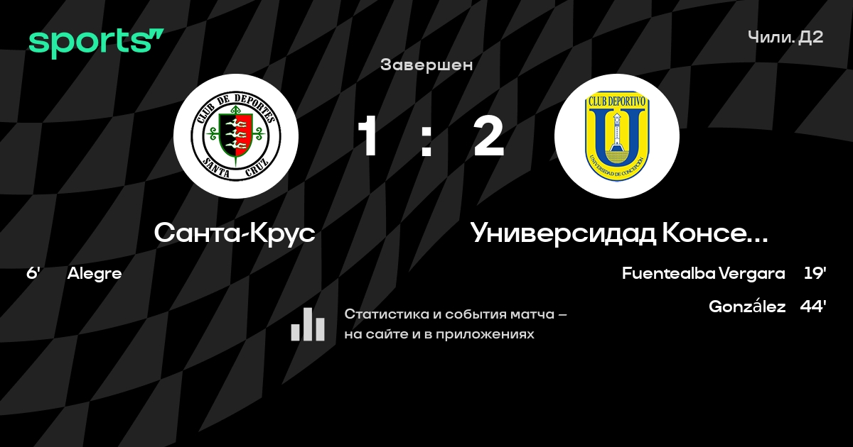 Результат прошлой игры в турнире «Примера B»: Консепсьон – Санта-Крус 1:0. После 19 туров Санта-Крус набирает 19 очков и занимает 14 место в турнире. Лучший бомбардир команды – M. Moreno: он забил 7 в 12 матчах. Санта-Крус не может выиграть в 4 последних матчах в рамках турнира «Примера B». В последних 5 играх Санта-Крус забивает 6 голов. В последних 5 играх Санта-Крус пропускает 5 голов.