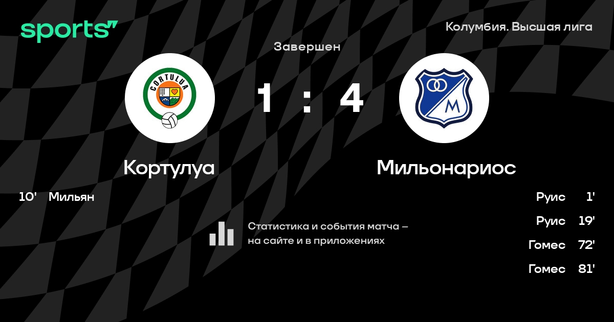 Результат прошлой игры в турнире «Примера A»: Депортиво Перейра – Кортулуа 2:1. После 20 туров Кортулуа набирает 20 очков и занимает 18 место в турнире. Лучший бомбардир команды – K. Valencia: он забил 2 в 8 матчах. Кортулуа проигрывает в 3 последних матчах в рамках турнира «Примера A». Мильонариос имеет в активе больше всех побед в турнире – 13. Кортулуа пропускает в 3 последних матчах в турнире «Примера A». В последних 5 играх Кортулуа забивает 3 голов. В последних 5 играх Кортулуа пропускает 8 голов.